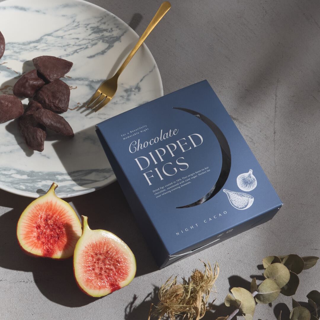 ドライいちじくにタイ産の70%ダークチョコレートをコーティングした人気の商品、一口食べると止まらない人、続出!ギフトにも人気。